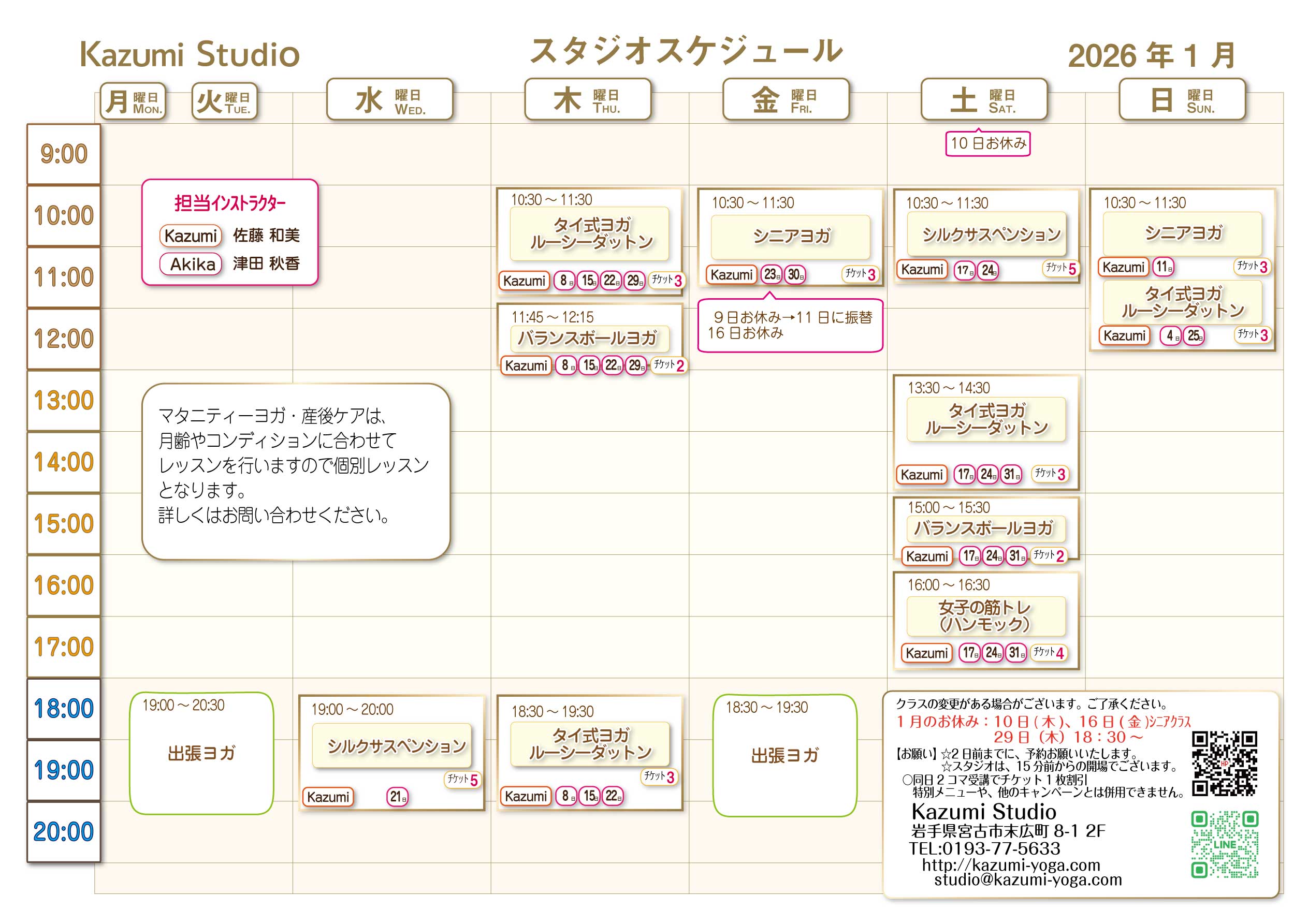 カズミスタジオの定休日は毎週、月曜日と火曜日です。